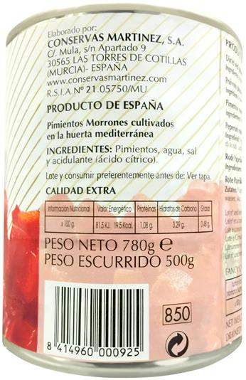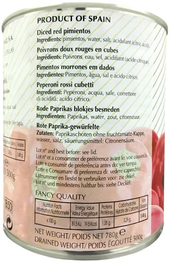 スペインの東南部、地中海に近いムルシア地方でとれた高品質の赤ピーマンを剥いで水煮にしたものです。明るい独自の赤みは料理にアクセントを添えます。ピザ、サラダ、オムレツ、ピラフなど幅広くご利用頂けます。1cm角のダイスカットです。
