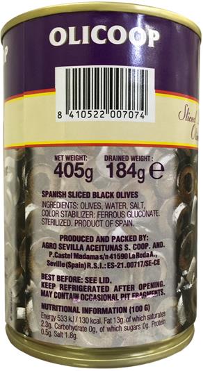 | 原料 | 水50.59%、 オリーブの実47.79%、 食塩1.61% |