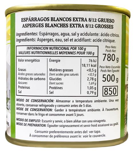 このスペイン産のホワイトアスパラは国内では手に入らないほどの極太タイプの水煮缶。また他国産のようなスジや固い部分がなく、口の中でとろけるような柔らかさはこの種類だけです。味付けはされておりません。アリオリソースなどがよく合います。1缶当たり8本から12本入り。