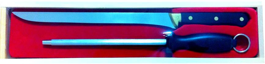 生ハムをカットするのに最適なスペイン本場のナイフ。切れ味は非常に鋭いので綺麗にカットしやすく、研ぎ棒とセットになっております。1セットから発送が可能です。ナイフは刃渡り25cm、全長36cm、研ぎ棒全長31.5cm。